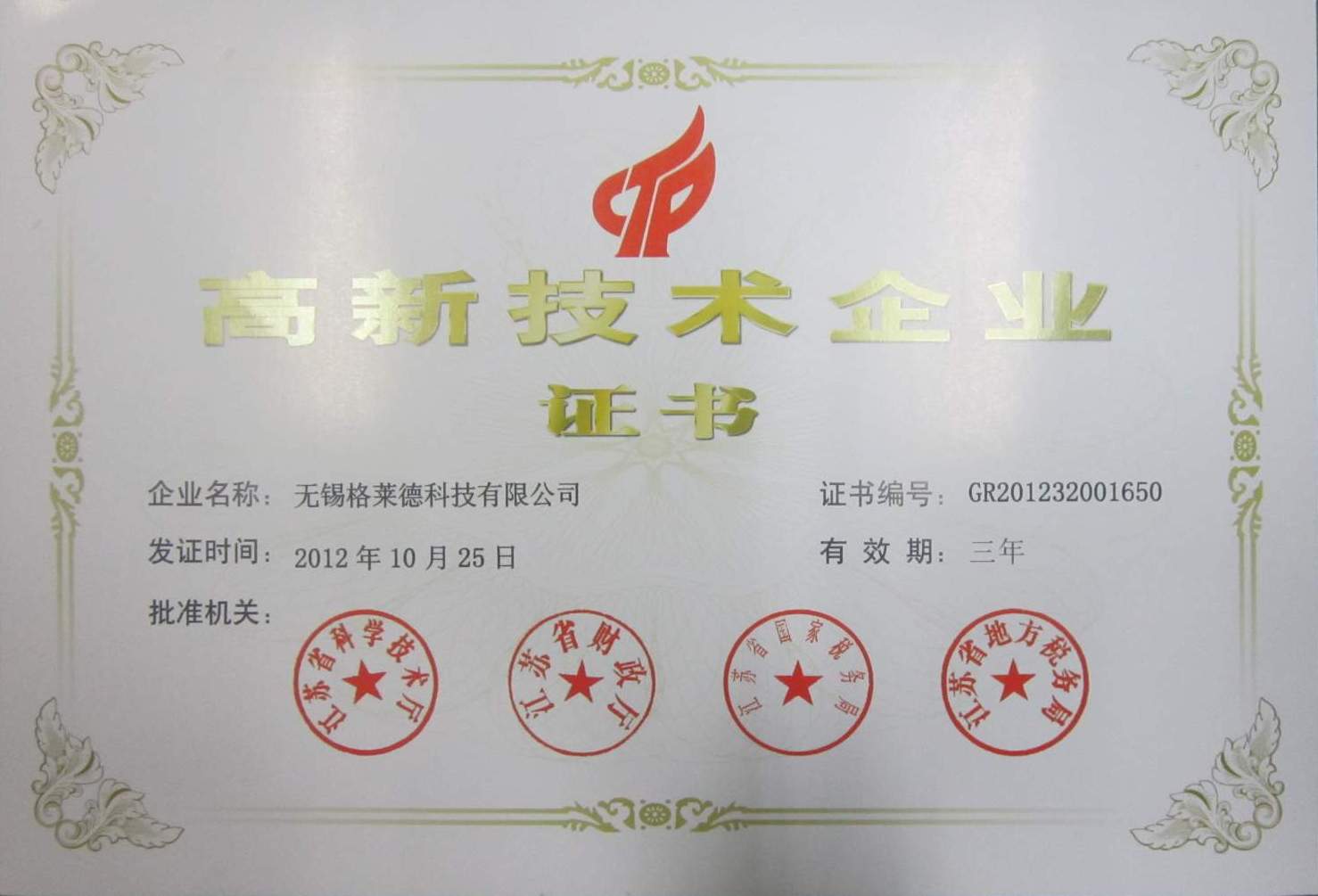 高新技術(shù)企業(yè)證書(shū)