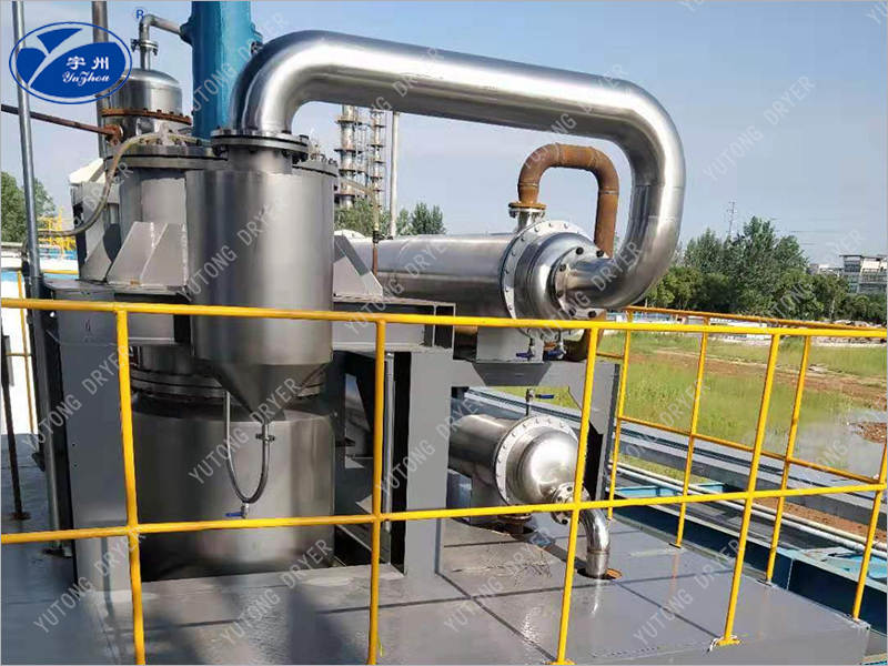 The material enters the evaporator radially from above the heating zone, and is distributed to the heating wall of the evaporator through the distributor. Then, the rotating scraper continuously and uniformly scrapes the material into a thin and uniform liquid film on the heating surface, and pushes it downwards in a spiral shape. During this process, the rotating scraper ensures continuous and uniform liquid film to generate high-speed turbulence, and prevents the liquid film from coking and scaling on the heating surface, thereby improving the total transfer coefficient. Light components are evaporated to form a steam stream that rises and passes through a vapor-liquid separator to reach an external condenser directly connected to the evaporator. Heavy components are discharged from the cone at the bottom of the evaporator.