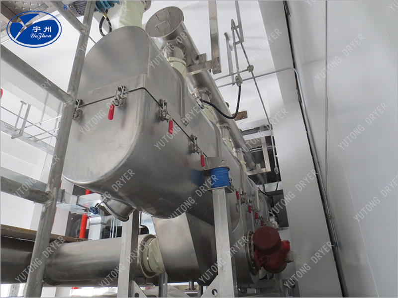 ③由于施加振動,可使最小流化氣速降低,因而可顯著降低空氣需求量,進而降低粉塵層夾帶,配套熱源,風機,旋風分離器等也可相應縮小規(guī)格,成套設備降低,節(jié)能效果明顯。可方便地依靠調整振動參數(shù)來改變在機內滯留時間。其活塞流式的運行降低了物料粒度均勻性及規(guī)則性要求,易于獲得均勻的干燥產品。