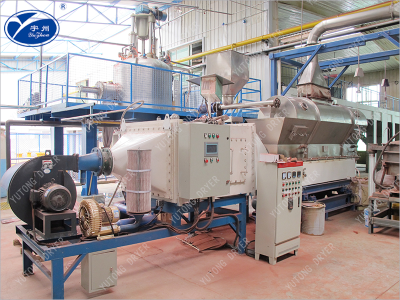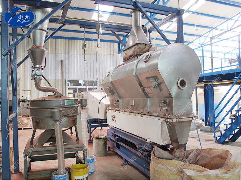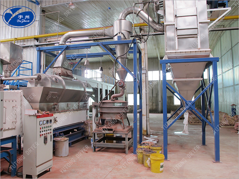 物料為硫酸鎳,具有強(qiáng)酸性及強(qiáng)腐蝕性,我司針對這一特點(diǎn),在設(shè)備制造上進(jìn)行升級及改進(jìn),振動流化床的上箱體和下箱體以及內(nèi)表壁均采用3mm的玻璃鋼全貼附,振動板采用特制鎳板沖鴨舌孔制作,尾氣排放全部采用耐高溫耐腐蝕的玻璃鋼材料制作。支撐架和支撐管也特別采用了碳鋼特氟龍材料。為了使排放達(dá)到良好效果,布袋除塵器的布袋選擇特殊材質(zhì),極其耐酸,連引風(fēng)機(jī)變頻調(diào)風(fēng)也采用了FRP制作。此工藝很好的解決了材料干燥過程中遇到的高溫、高腐蝕的難題。
