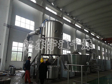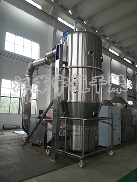 FL型沸騰制粒干燥機(jī):物料粉末粒子,在原料容器(流化床)中呈環(huán)形流化狀態(tài)。受到經(jīng)過(guò)凈化后的加熱空氣預(yù)熱和混合,將粘合劑溶液霧化噴入,使若干粒子聚集成含有粘合劑的團(tuán)粒,由于熱空氣對(duì)物料的不斷干燥,使團(tuán)粒中的水分蒸發(fā),粘合劑凝固,此過(guò)程不斷重復(fù)進(jìn)行,形成理想的、均勻的多微孔球狀顆粒。