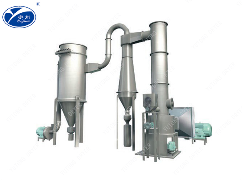 粒度分級:在干燥主機(jī)的上部設(shè)置環(huán)形擋板,此被稱為閃蒸干燥機(jī)分級器。當(dāng)物料運(yùn)動經(jīng)過該分級器時變會受到離心力的作用,呈現(xiàn)不同旋轉(zhuǎn)半徑螺旋上升的趨勢。粒徑較小的物料從分級器的內(nèi)孔排出;顆粒較大的物料被留在干燥室內(nèi)繼續(xù)粉碎,待達(dá)到標(biāo)準(zhǔn)粒度從內(nèi)孔排出。