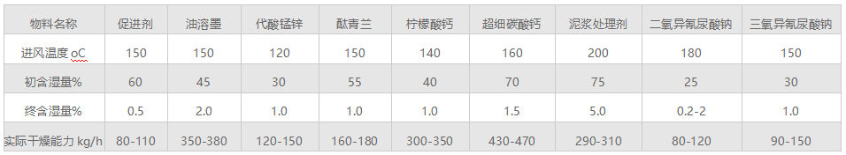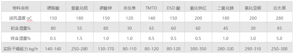 注:1、水份蒸發(fā)量以進(jìn)風(fēng)溫度200℃出風(fēng)80℃計(jì)算;2、裝機(jī)容量為基本數(shù)據(jù),可根據(jù)物料的理化性能改變;3、占地面積根據(jù)實(shí)際情況布置,表中數(shù)據(jù)僅供參考。