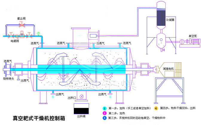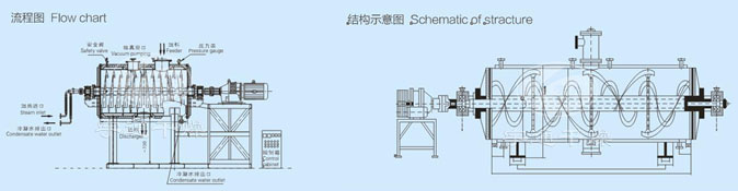 本機是一種新型臥式間歇式真空干燥設(shè)備,濕物料經(jīng)傳導(dǎo)蒸發(fā),帶有刮板攪拌器不斷清除內(nèi)壁上的物料,并在容器內(nèi)推移形成循環(huán)流,水份蒸發(fā)后由真空泵抽出。