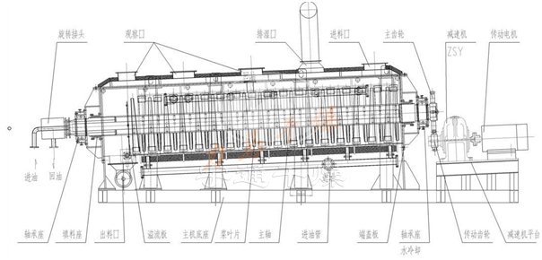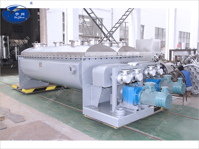 空心軸上密集排列著楔型中空漿葉,熱介質經空心軸流經漿葉。單位有效容積內傳熱面積很大,熱介質溫度從-40℃到320℃,可以是水蒸汽,也可以是液體型:如熱水、導熱油等。間接傳導加熱,沒有攜帶空氣帶走熱量,熱量均用來加熱物料。熱量損失僅為通過器體保溫層向環(huán)境的散熱。楔型漿葉傳熱面具有自清潔功能。物料顆粒與楔型面的相對運動產生洗刷作用,能夠洗刷掉楔型面上附著物料,使運轉中一直保持著清潔的傳熱面。漿葉干燥機的殼體為Ω型,殼體內一般安排二到四根空心攪拌軸。殼體有密封端蓋與上蓋,防止物料粉塵外泄而充分發(fā)揮作用。
