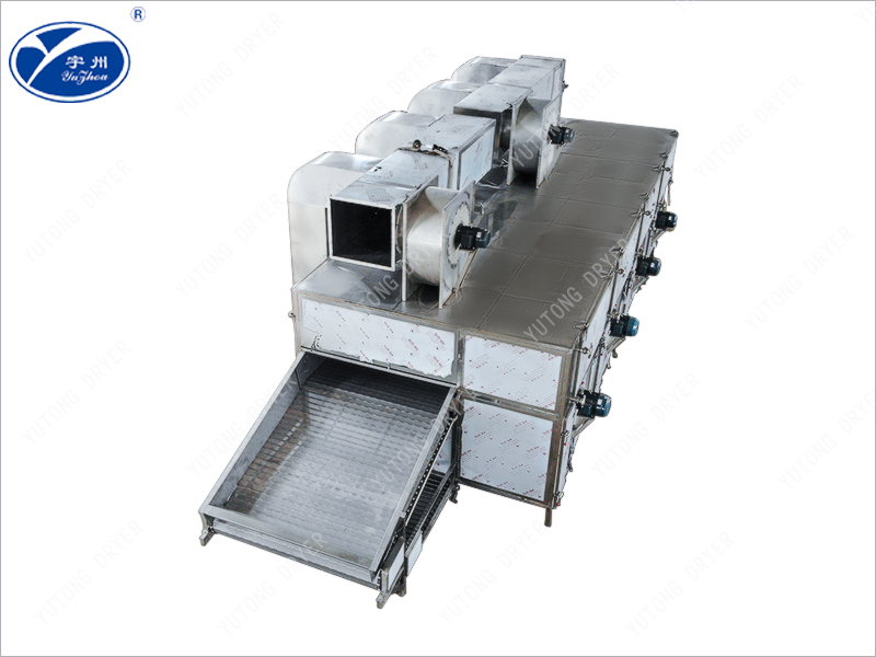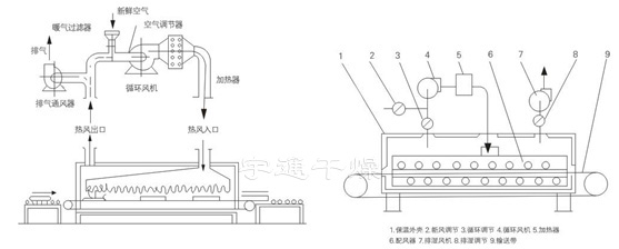 工作時(shí)熱風(fēng)以孔束流由上下同時(shí)噴向輸送帶上的物流,由于噴射氣速高達(dá)15m/s以上,故對(duì)流傳熱的膜極薄,傳熱系數(shù)大,干燥速度快,該設(shè)備用與不透氣類(lèi)物料時(shí),上面噴射氣流仍返回上面,下面噴出的氣流仍返回下面,在參與循環(huán)。對(duì)透氣性物料氣流束具有強(qiáng)穿透性及在物料內(nèi)部的擴(kuò)散性。使用熱源可以是蒸汽,電,熱風(fēng)爐及燃油煙道氣等。