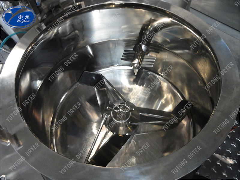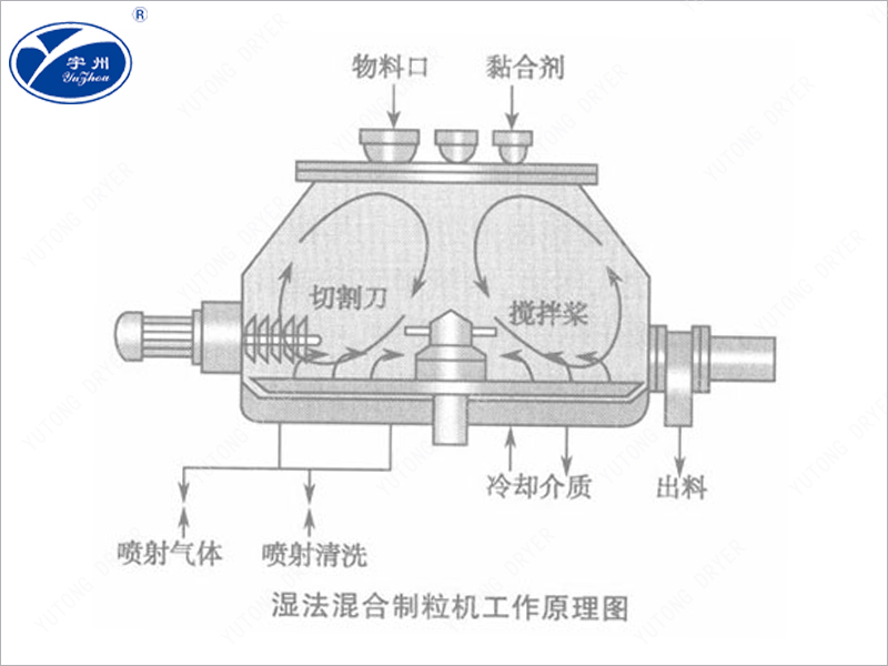 粉體物料與粘合劑在圓筒形容器中由底部混合漿充分混合成濕潤(rùn)軟材,然后由側(cè)置的高速粉碎槳切割成均勻的濕顆粒。