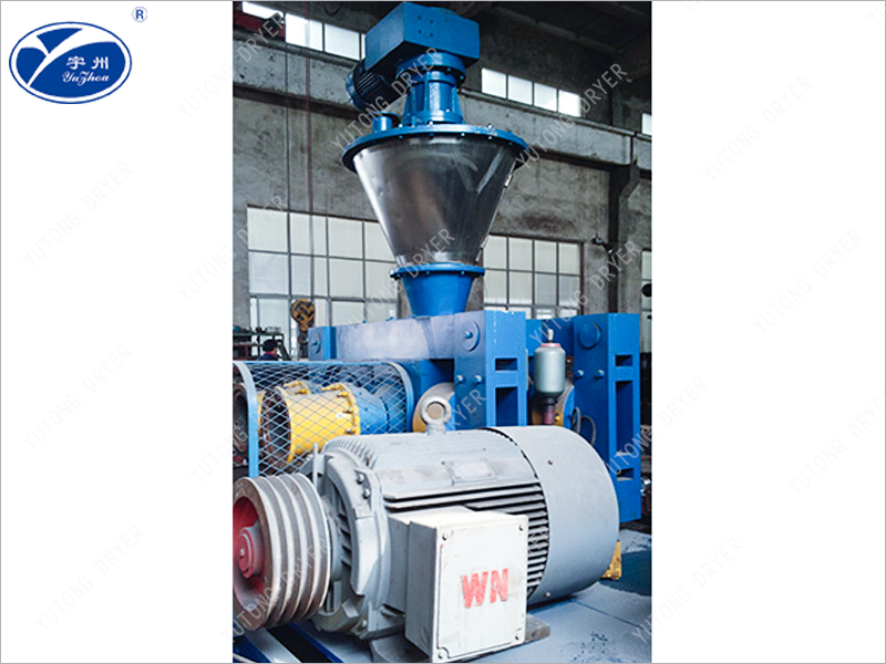 各種干粉物料從設備頂部加入,經(jīng)脫氣、螺旋預壓進入兩個平等軋輥,軋輥相對旋轉(zhuǎn),物料被強制送入兩輥之間,帶槽軋輥將物料咬入輥隙被強制壓縮,物料通過壓縮區(qū)后,物料的表面張力和重力使之自然脫出。脫出后的指條狀團塊進入碎粒機由旋轉(zhuǎn)刀排破碎,被破碎的物料進入整粒機通過滾動刀排使顆粒和部分粉狀物料進入旋振篩進行篩分。合格品通過輸送機被送入成品倉。粉狀篩下物料通過輸送機再次被送回原料倉進行二次輥壓,擠壓力的大小可根據(jù)造粒操作的需要由液壓油缸的壓力進行調(diào)節(jié)。 通過改變輥面開槽形式,可得到片狀、條狀、扁球狀物料。