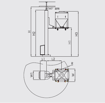 Машина состоит только из стойки, вращающегося шасси, вилочного погрузчика, гидравлической системы и системы управления. Во время работы бункер, заполненный материалом, толкается на вилку подъема, управляет подъемным стержнем, поднимает бункер на высоту подачи, вращающаяся стойка стыковается с устройством подачи, открывает клапан - бабочка разгрузки, материал переносится на следующее технологическое оборудование.